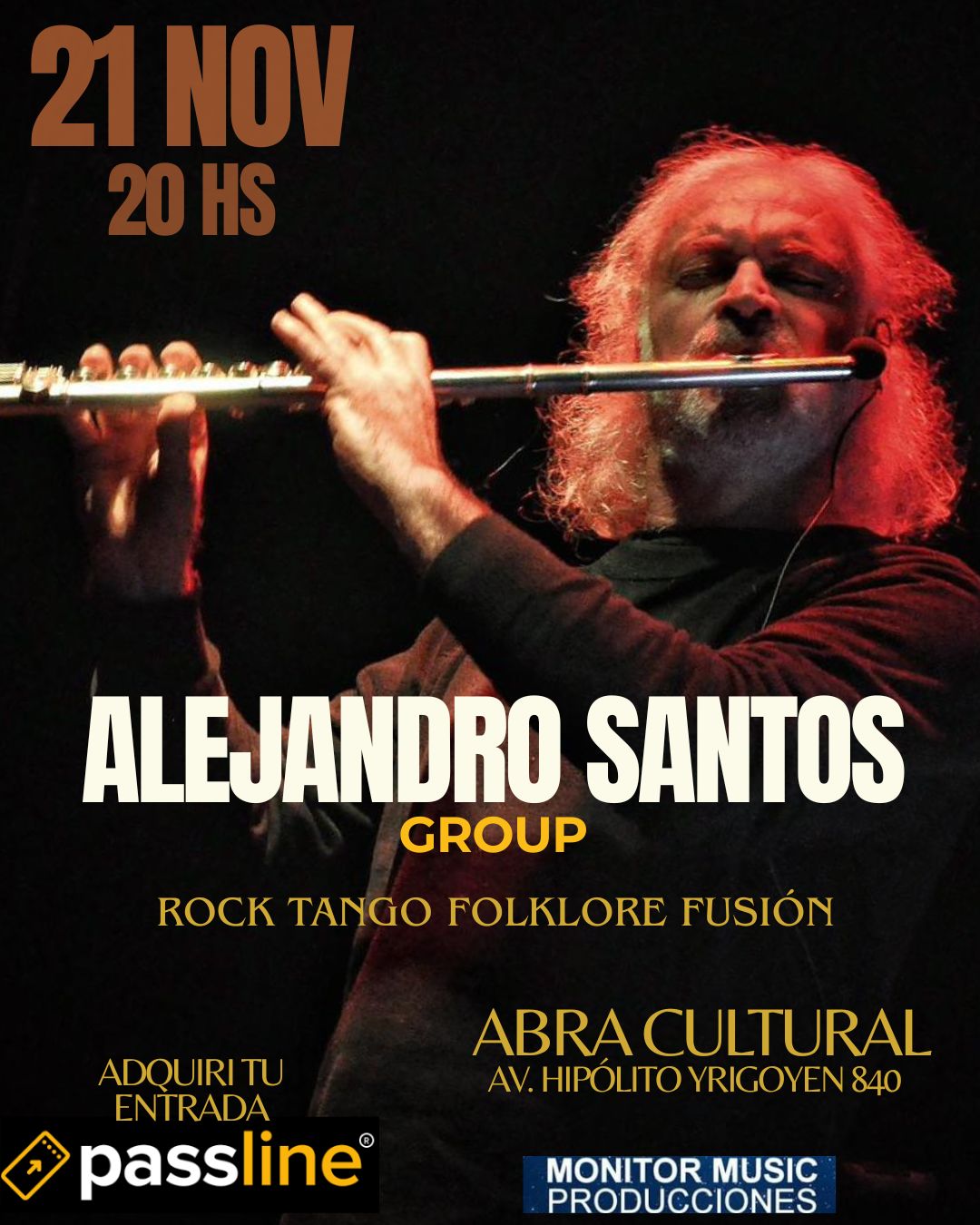 Alejandro Santos flautista y multi-instrumentista, toca flauta traversa, flauta baja, aerofonos nativos, saxo tenor y soprano, piano, sintetizadores, guitarra y canto. Compositor con estilo propio, fusiona el jazz moderno con ritmos tradicionales argentinos.